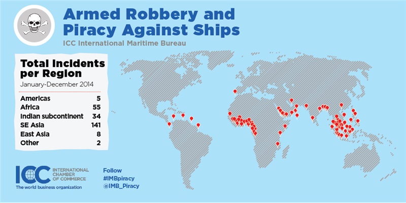 London and Kuala Lumpur, 14 January 2015 – Attacks against small tankers off South East Asia’s coasts caused a rise in global ship hijackings, up to 21 in 2014 from 12 in 2013, despite piracy at sea falling to its lowest level in eight years, the International Chamber of Commerce (ICC) International Maritime Bureau (IMB) has revealed. Pirates took 442 crewmembers hostage, compared with 304 in 2013.